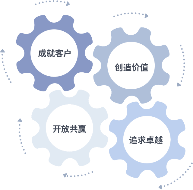 成就客户是一切决策的出发点,,创造价值是衡量所有工作的标准,,追求卓越是我们做事做人的态度,,,开放共赢是我们的格局也是最终的结果。。。价值观的齿轮环环相扣,,,推动着组织里的每个人不断向前。。