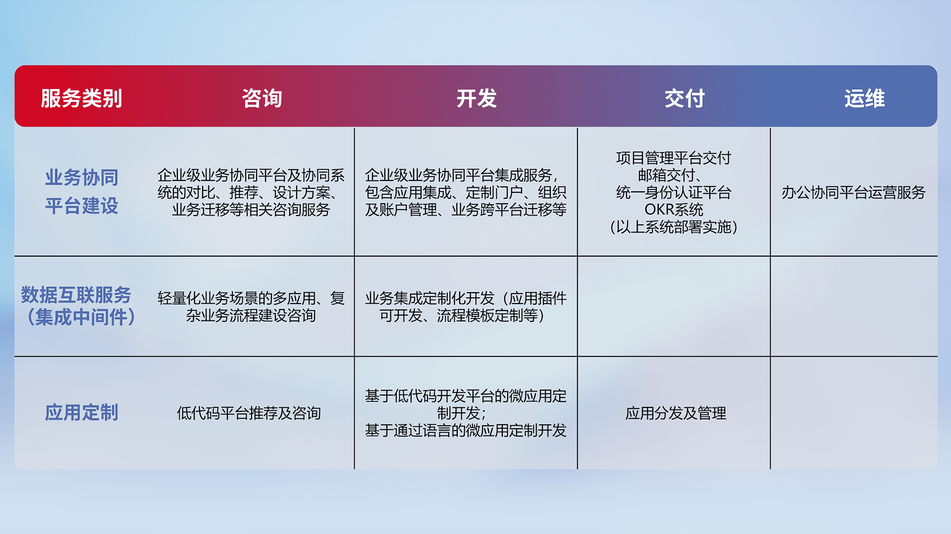 针对钉钉、、、、企微、、、IDaas等平台级产品提供产品的规划、、、方案、、交付、、、、定制化开发等服务,,,实现如统一协同办公、、智能客户服务、、、、混合会议管理、、、智能数据查询、、、等业务场景,,,,实现数字化转型。。。